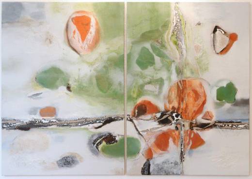 Auf einem Format von 2,00 m mal 1,40 m entstand dieses spezielle Bild. Selbstverständlich mit den Farbwünschen von Jutta Schneider: Belebendes Grün, kräftigendes Orange, dem nahegelegenen Rhein nachempfundenes Blau und ein alles einschließendes Grau. Die spontanen und freiwilligen Reaktionen der Patienten bestätigen, wie positiv das fertige Bild nun auf sie wirkt.