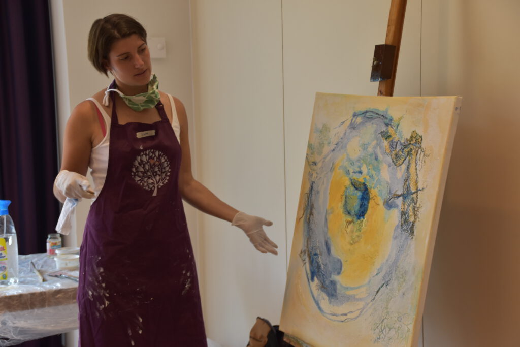 Für mich bedeutet die Zeit beim gemeinschaftlichen Malen eine Zeit von Entspannung und Freude, wenn ich abtauchen kann in Farben, Linien und Struktur … die 2 Stunden sind jedes Mal viel zu schnell vorbei.“